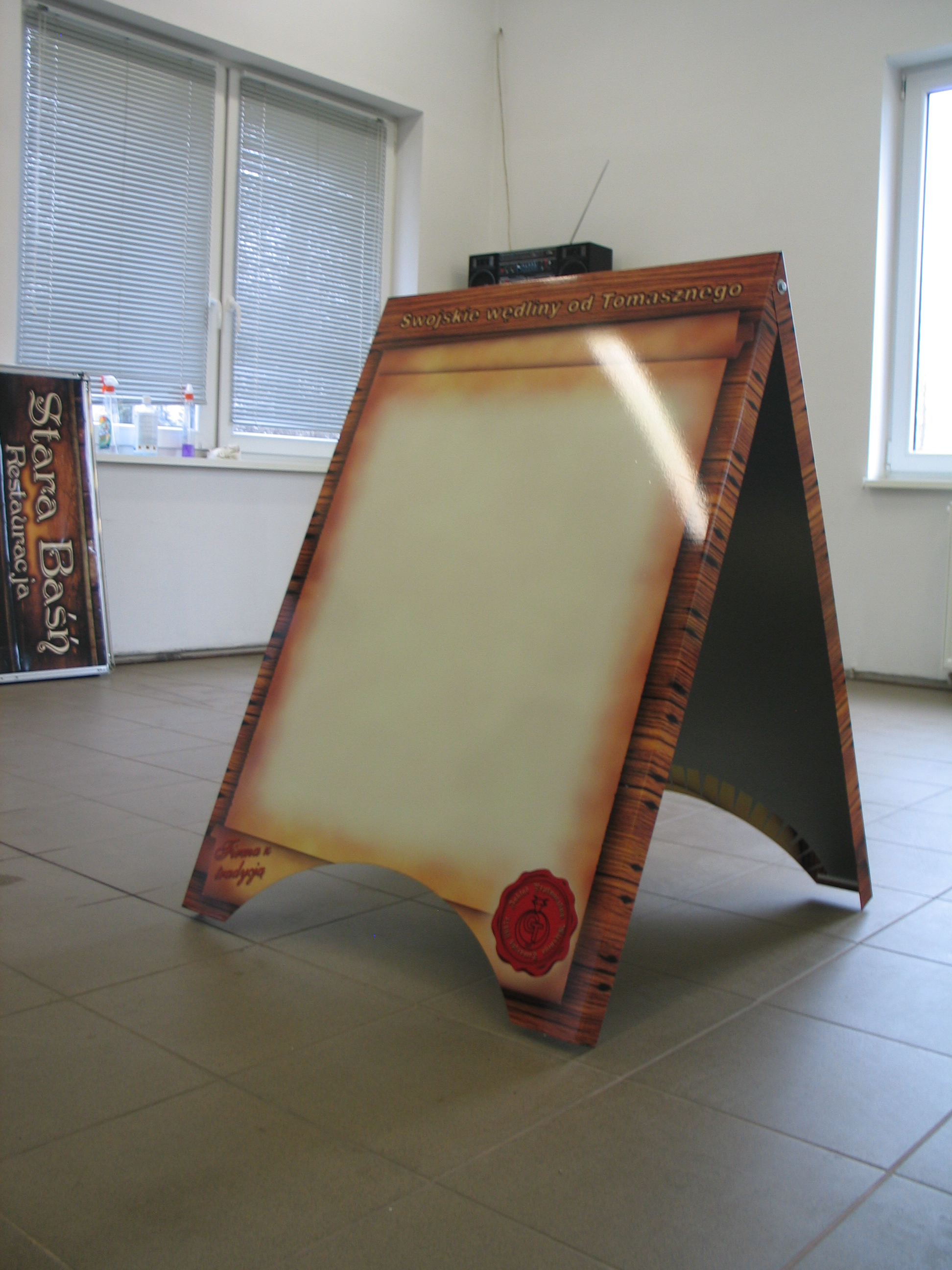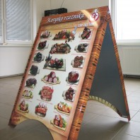 Potykacze to wygodna forma reklamy przenośnej. Wykonane są z solidnej konstrukcji stalowej, odpornej na warunki atmosferyczne i uszkodzenia mechaniczne, wyklejone dwustronnie grafiką pełnokolorową z laminatem odpornym na promienie UV oraz ścieranie. Oferujemy potykacze o wymiarach 1000 x 700cm.